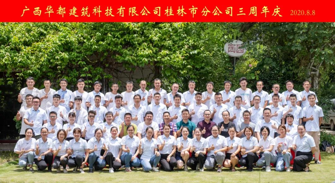 廣西華都建筑科技有限公司桂林市分公司成立三周年了。2020年8月8日,公司董事、公司總部領(lǐng)導(dǎo)以及分公司全體員工前往桂林市‘世外桃源’舉辦廣西華都建筑科技有限公司桂林市分公司三周年慶典活動。
